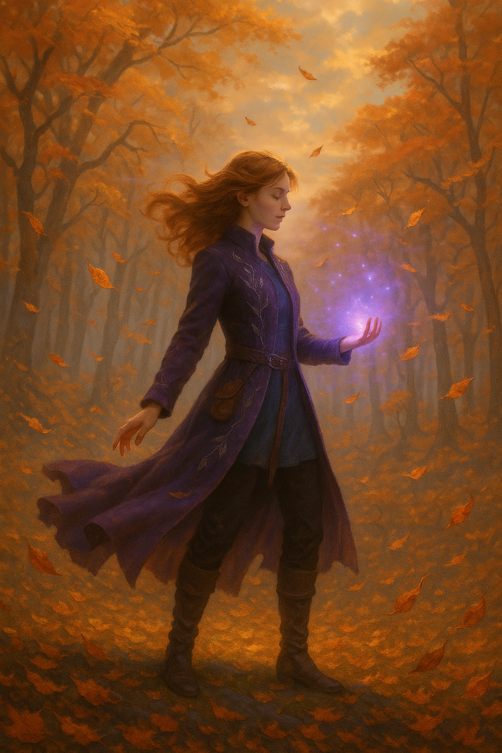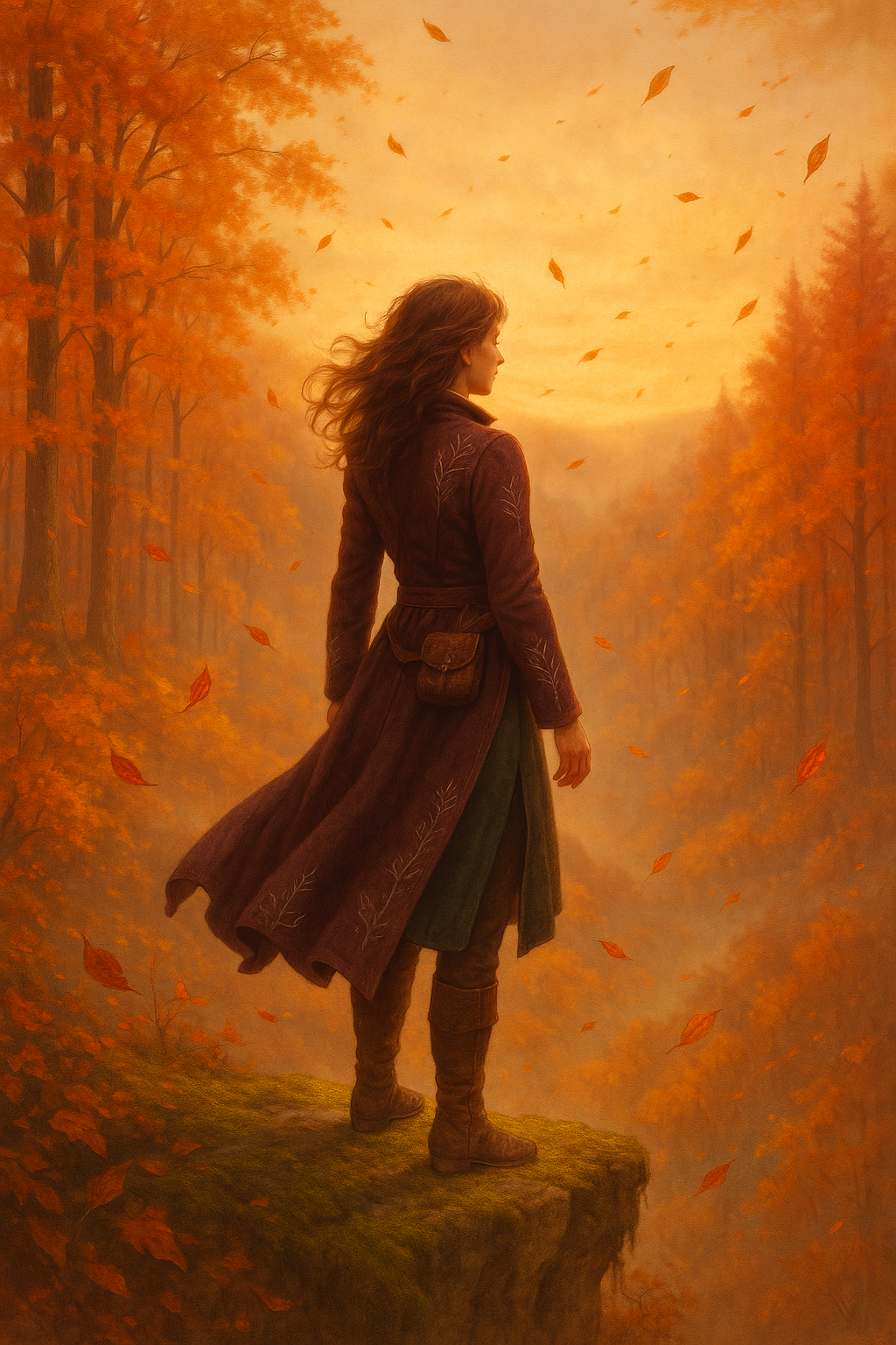 Listy planou v ohnivých barvách a snášejí se k zemi v nekonečném tanci. Vzduch voní dřevem, mechem a něčím, co nelze pojmenovat – snad vzpomínkami, snad ztracenými slovy. Když Awelie vstoupila do krajiny, nebyla to pouhá návštěva. Byl to návrat. Po dlouhých letech bloudění v bezčasé Prázdnotě znovu pocítila váhu světla, strukturu ticha, krásu prostého bytí.